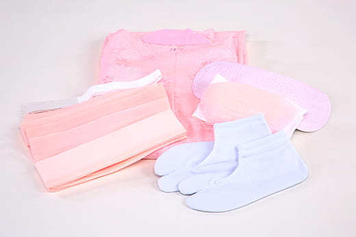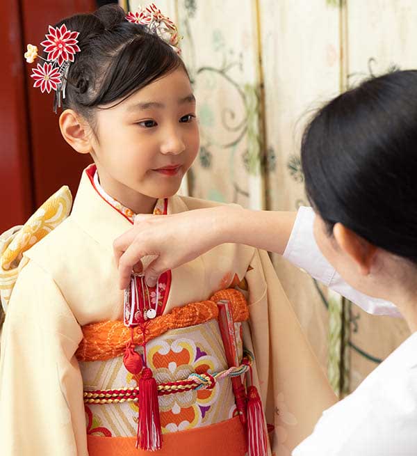 長襦袢や腰紐といった小物類も大人と同等のものを使用し、帯は、成形された造り帯ではなく、着付け師が手で結びます。